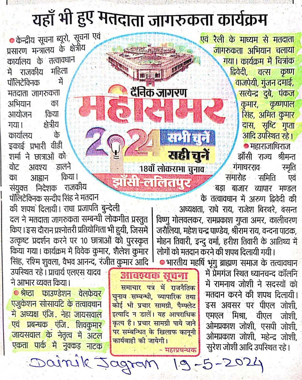 आज दिनाक 20,21, 22 अप्रैल 2024 को तीन दिवस कार्यक्रम श्रेष्ठ फाउंडेशन वेलफेयर सोसाइटी की ओर से विश्वा पृथ्वी दिवस मनाया गया इस प्रोग्राम में देव अकैडमी रक्सा, अग्रसेन विद्या मंदिर इंटर कॉलेज सीपरी रोड एवं टाइम्स इंस्टीट्यूट झांसी गुरुद्वारा सिपरी बाज़ार मे विभिन्त्रा छात्रों द्वार रा विश्व पृथ्वी दिवस का कार्यक्रम आयोजन किया गया " पृथ्वी हमारी धरोहर है"