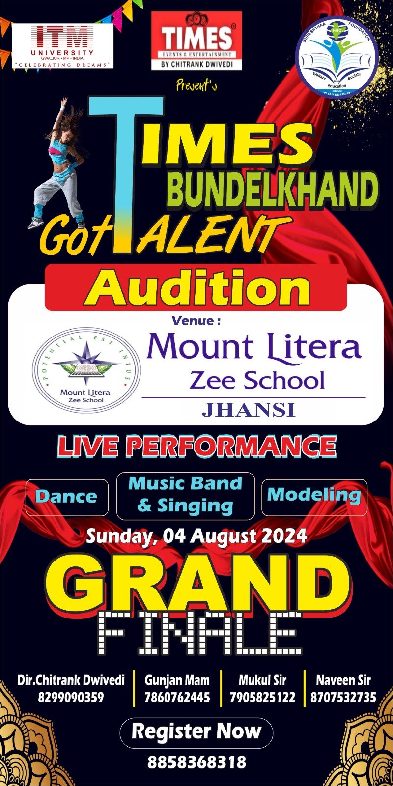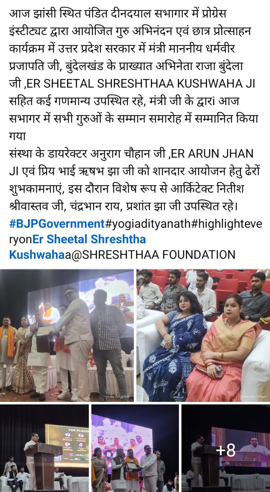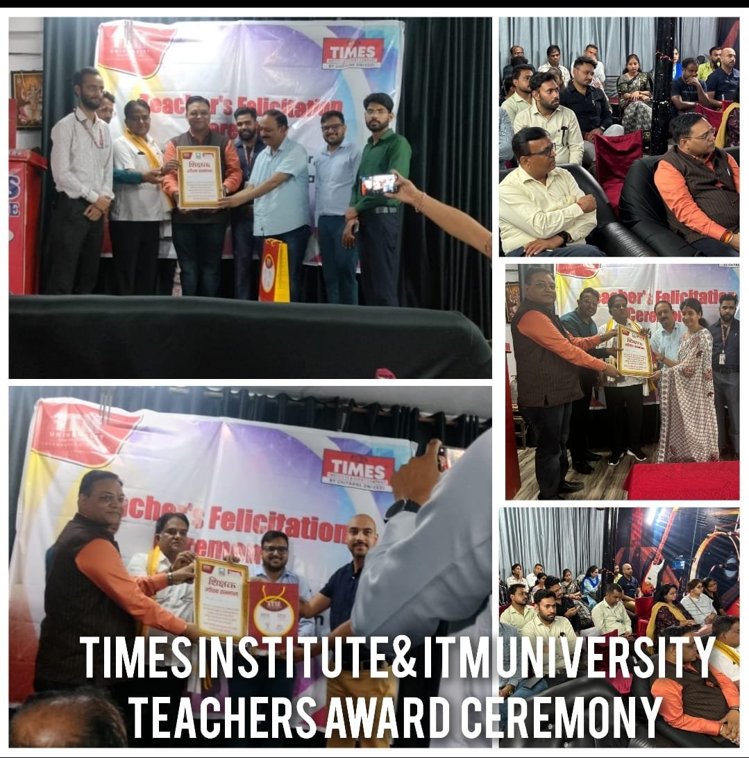 SHRESHTHAA FOUNDATION,आईटीएम यूनिवर्सिटी ग्वालियर और टाइम इंस्टीट्यूट के संचालक चित्रांक द्विवेदी की अध्यक्षता में टाइम इंस्टीट्यूट पर शिक्षक सम्मान समारोह का आयोजन किया गया जिसमें मुख्य अतिथि डा. बालमुकुंद जी , विशिष्ट अतिथि इंजी.एस के जायसवाल निदेशक श्रेष्ठ फाउंडेशन और झाँसी ललितपुर लोकसभा वा शहर के जाने-माने शिक्षाविदों ने शिरकत की। और आईटीएम यूनिवर्सिटी से गौरव जेसवानी द्वारा शिक्षकों को निकट भविष्य में छात्रों को उनकी रुचि के कोर्स (विषय) चुनने और एडमिशन की प्रक्रिया के साथ-साथ उन्हें विश्वविद्यालय में चलाए जा रहे विभिन्न पाठ्यक्रमों तथा आर्थिक रूप से कमजोर व मेधावी छात्रों के लिए विश्वविद्यालय द्वारा चलाई जा रही छात्रवृत्ति योजनाओं की पूर्ण जानकारी प्रदान की गई। आईटीएम से उपस्थित-गौरव जेसवानी राघवेंद्र झा शुभम तिवारी निखिल तिवारी ने अपने विचार व्यक्त किए साथ ही उपस्थित सभी शिक्षकों को स्मृति चिन्ह के साथ प्रमाण-पत्र प्रदान कर सम्मानित किया गया।